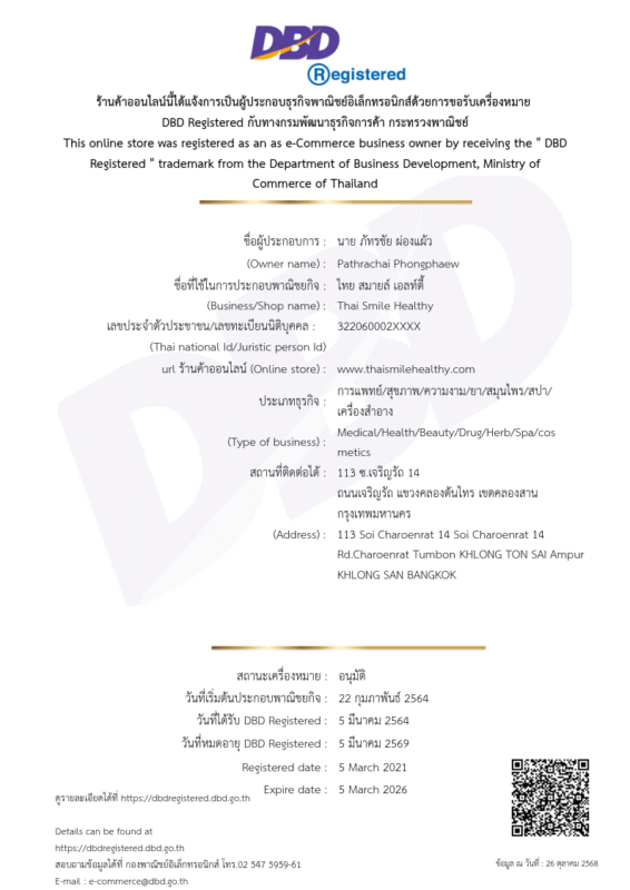 Thai Smile Healthy is a legally registered online entity, holding the official DBD Registered trademark from the Department of Business Development, Ministry of Commerce of Thailand, ensuring our operation meets all local commerce and consumer protection standards.